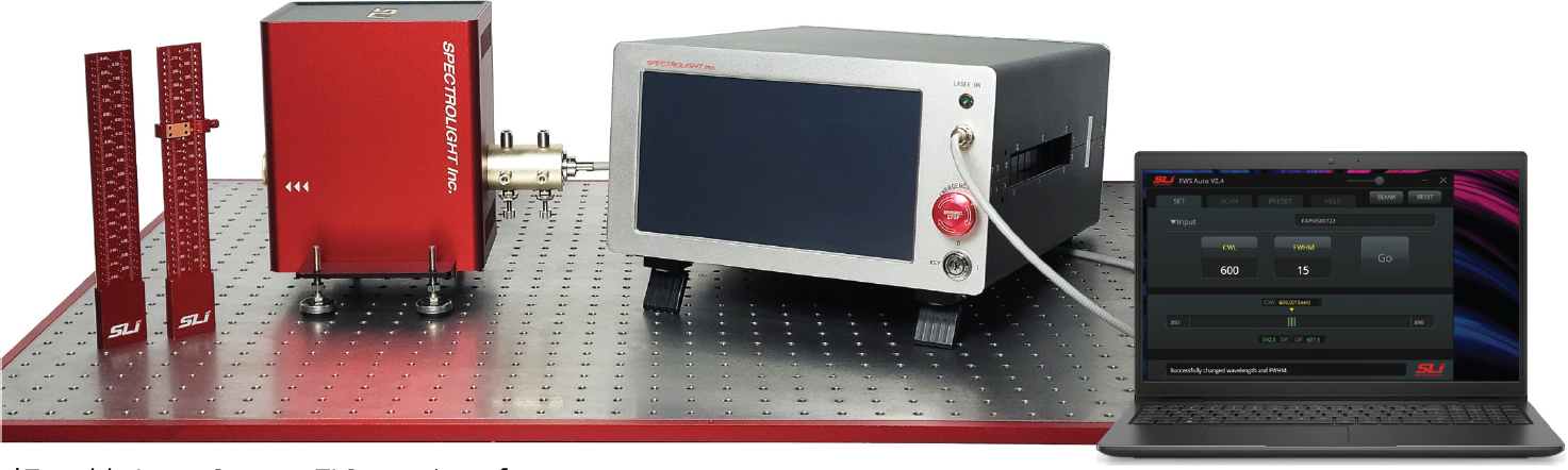 TLS-Picoは、スペクトロライト社が開発したスーパーコンティニウム光源(SC光源)を用いた波長可変光源システムです。最大波長範囲430~1650 nmのSC光源出力から、波長セレクタ(FWS-Poly)を通して簡単かつ正確に特定の波長の光パルスを選択・空間出力します。制御PCおよび調整用のビームアライナーが付属します。繰り返し周波数は10 kHz ~ 80 MHz(可変)で、可視~近赤外にわたる超広帯域分光計測や超高速時間分解分光に有用な光源です。波長範囲によって、TLS-Pico-BおよびTLS-Pico-Cの2種類があります。