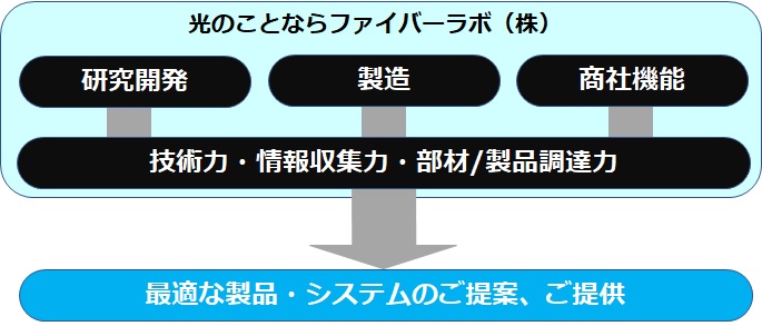 FLは光通信、レーザ、光計測などの分野の製品を中心に様々な光製品をお取り扱いしています。当社事業の特徴は、研究開発、製造、商社機能の三要素を備えていることです。お客様の様々なニーズにお応えするためには、メーカーとしての製品開発力、製造技術力に加え、世界の最新技術情報をいち早く把握する情報収集能力や世界から優れた製品や部品を調達する商社力が必要です。FLは三つの力を融合させ、お客様の真のニーズを理解して最適な製品・システムを常にご提案する光企業としてお客様のご期待にお応え致します。