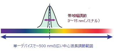 ・調節可能な中心波長  - 可変 または ~500 nmの広範囲でセット ・調節可能な帯域幅  - 3 ~ 15 nm(ノミナル) ・円形の均一なアパーチャ  - 3 mm