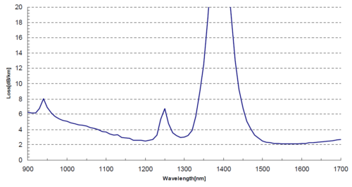 | クラッディング吸収 | 1.1±0.2 dB/m @ 915 nm 3.3 dB/m @ 975 nm(公称値) |