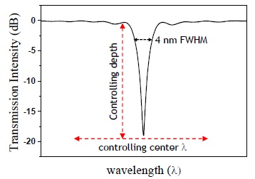 FWHM)となります。印加するRF信号の周波数と振幅を調節することによりフィルタの中心波長とノッチ深さをチューニングできます。複数のモードを伝搬するfew-mode fiber (FMF)を使用すると周波数シフター或いはモードコンバーターとして動作します。