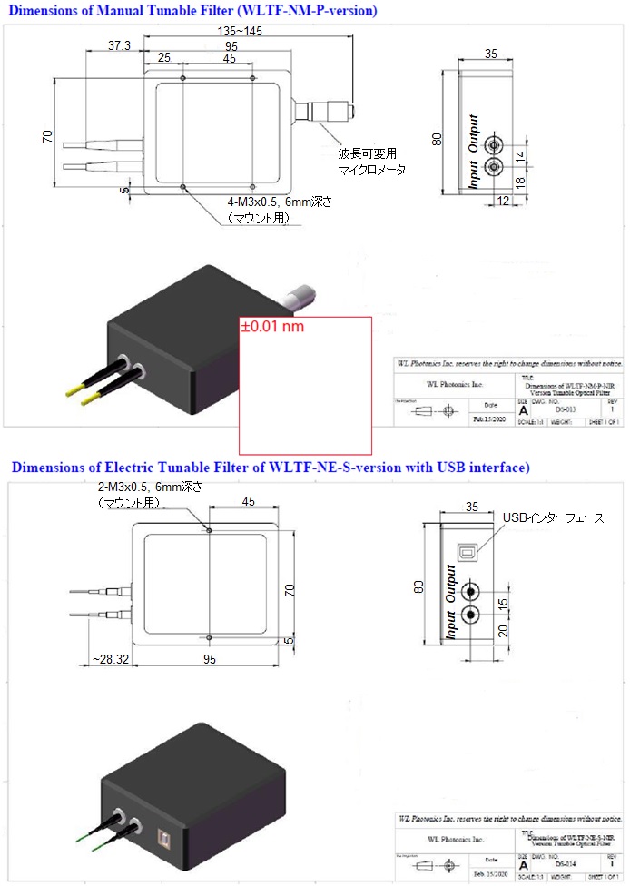 780-1000nm ガウシアン形状チューナブルフィルタ: WLTF-NM(-NE)は、回折格子をもつ空間型オプティクスで作られた可変バンドパスフィルタです。素子への入出力はピグテイルファイバです。広帯域光が入射されると一部の狭帯域の光のみを選択して出力し残りの光は除去されます。選択される狭帯域光の中心波長は精密マイクロメータあるいは電気的アクチュエーターにより可変できます。 特許出願中の独自光学設計により、従来にない低挿入損失、低PDLで様々なチューニング範囲や帯域幅のフィルタをご提供することができます。精密なチューニング機構により高い波長分解能と優れた波長チューニング再現性が可能です。780-1000nmのNIR帯域にわたり手動可変、電気的可変の何れもご利用いただけます。