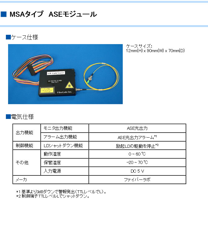 ASE光源は、広帯域光源、ブロードバンド光源とも呼ばれ、レーザ光のように強度が強く、かつ、スペクトル幅の広いインコヒーレント光を発生する光源です。 本製品は装置組み込みに便利なモジュールタイプのC-バンドASE光源です。モジュールサイズには、Lタイプ:36 x 190 x 132mm、Sタイプ:18 x 120 x 90mm、MSAタイプ:12 x 90 x 70mmの3種類があり、機種によってそれぞれ適用されます。いずれもDC5Vで動作いたします。光学的特性は対応するベンチトップ型の機種と同一です。