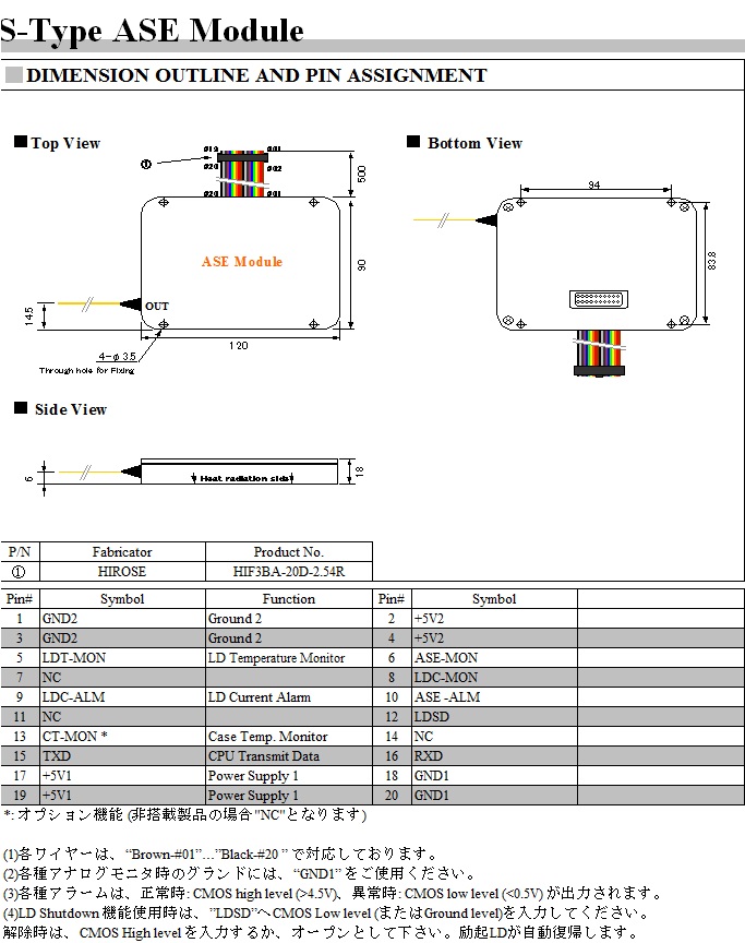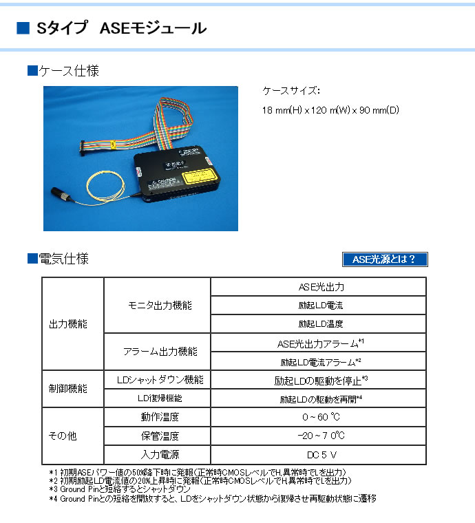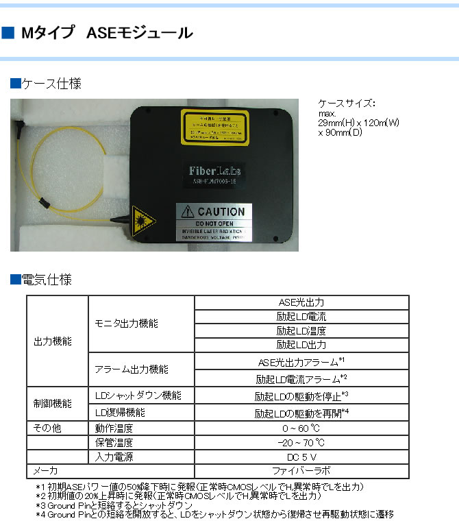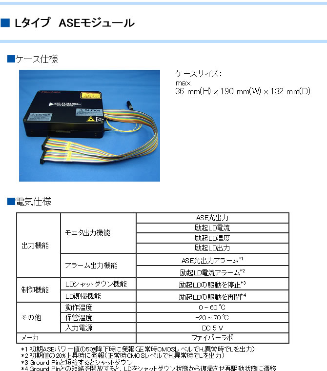 ASE光源は、広帯域光源、ブロードバンド光源とも呼ばれ、レーザ光のように強度が強く、かつ、スペクトル幅の広いインコヒーレント光を発生する光源です。 本製品は装置組み込みに便利なモジュールタイプのXバンドASE光源です。モジュールサイズには、Lタイプ:36 x 190 x 132mm、Mタイプ:28 x 120 x 90、Sタイプ:18 x 120 x 90mmがあり、機種によってそれぞれ適用されます。いずれもDC5Vで動作いたします。光学的特性は対応するベンチトップ型の機種と同一です。