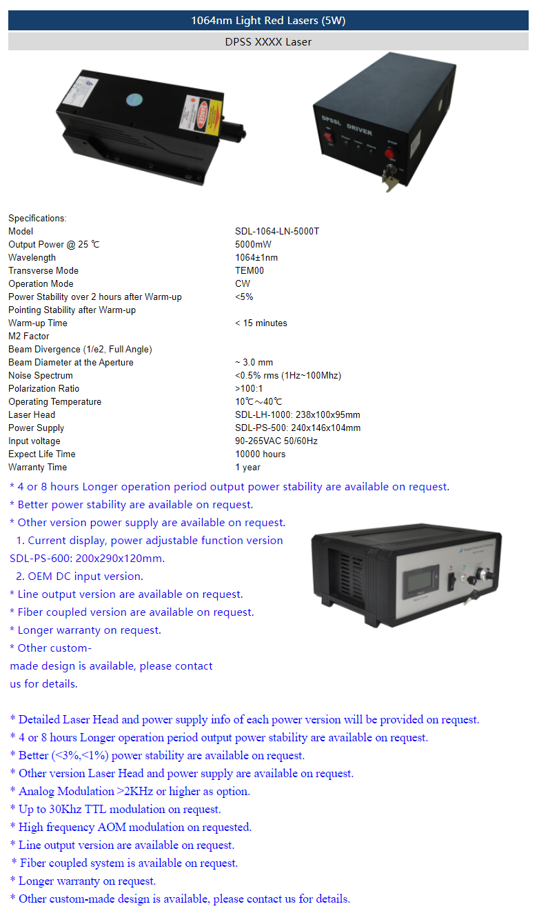 | 1064 nm | 5 W | <0.5% (rms, 1 Hz-100 MHz) |