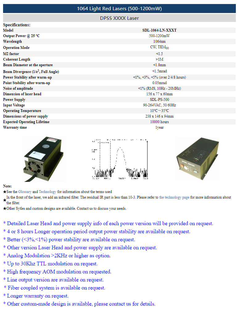 | 1064 nm | 500 ~ 1,200 mW | <1% (rms, 10 Hz-20 MHz) |