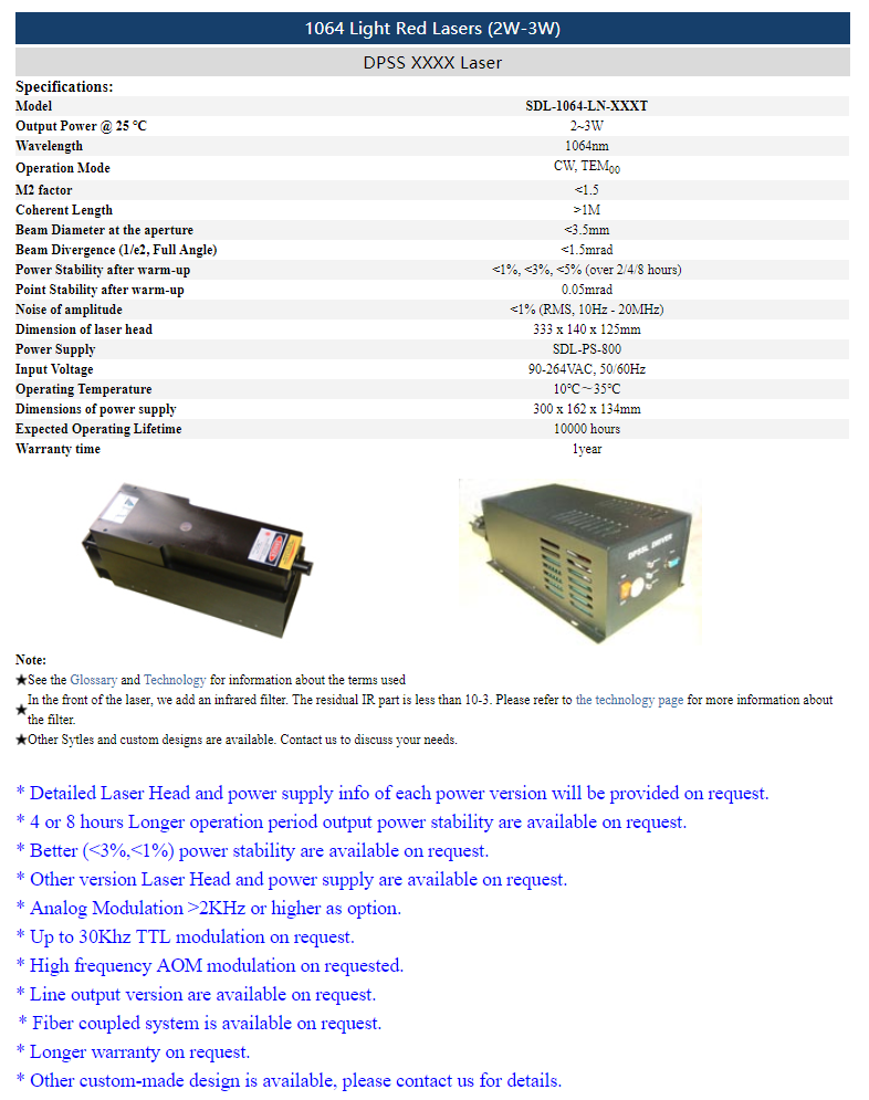 | 1064 nm | 2 ~ 3 W | <1% (rms, 10 Hz-20 MHz) |