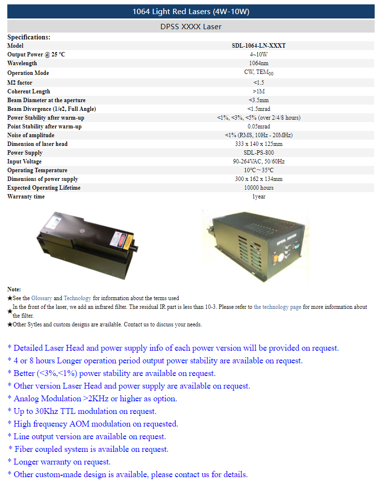 | 1064 nm | 4 ~ 10 W | <1% (rms, 10 Hz-20 MHz) |