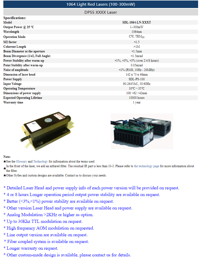 | 1064 nm | 1 ~ 300 mW | <1% (rms, 10 Hz-20 MHz) |