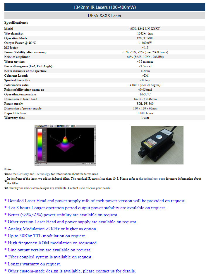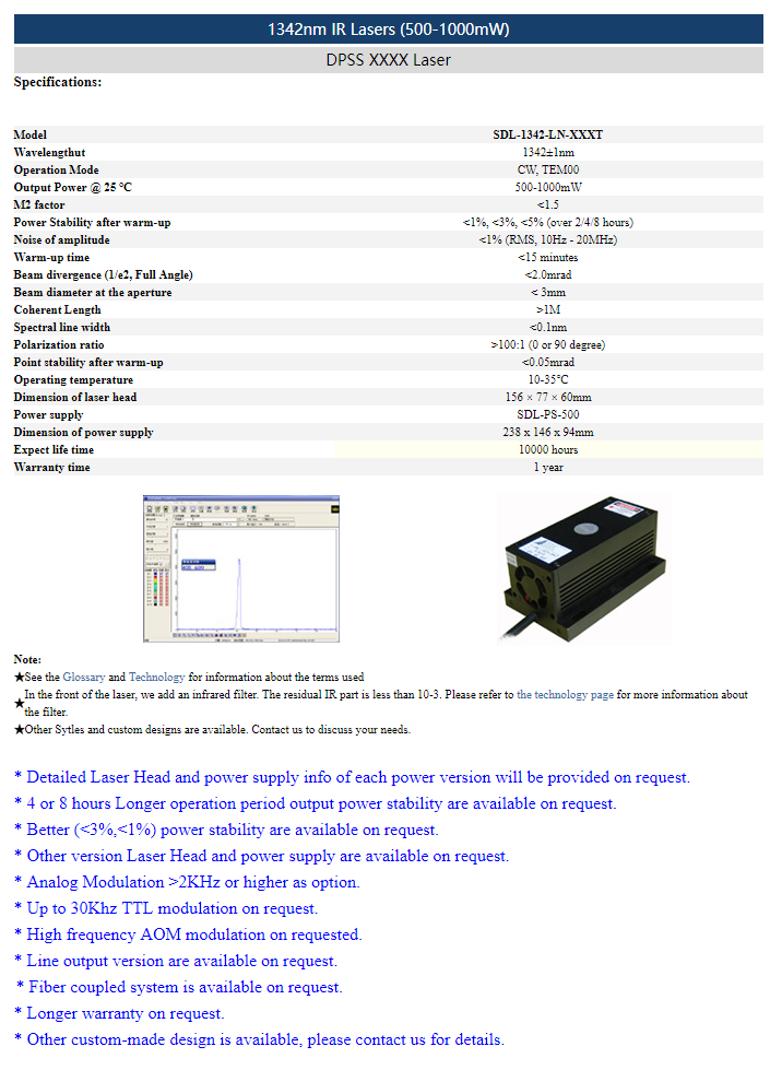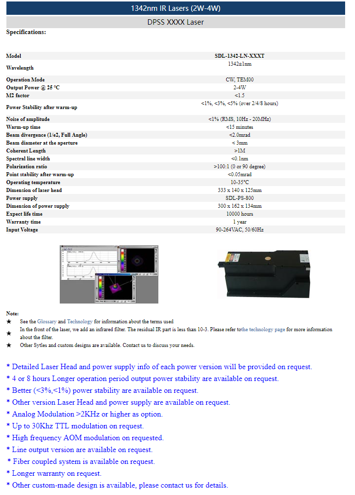 | 1342 nm | 500 ~ 1000 mW | <1% (rms, 10 Hz-20 MHz) |