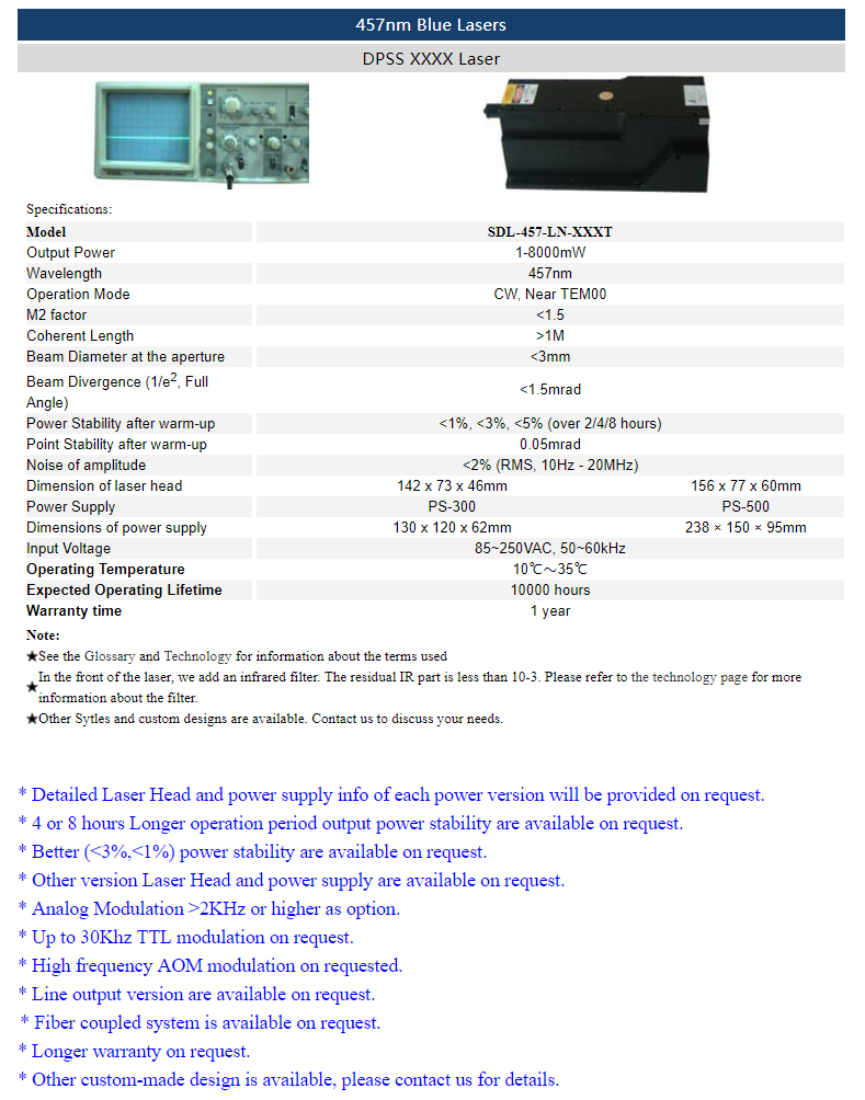 | 457 nm | 1 ~ 8,000 mW | <2% (rms, 10 Hz-20 MHz) |