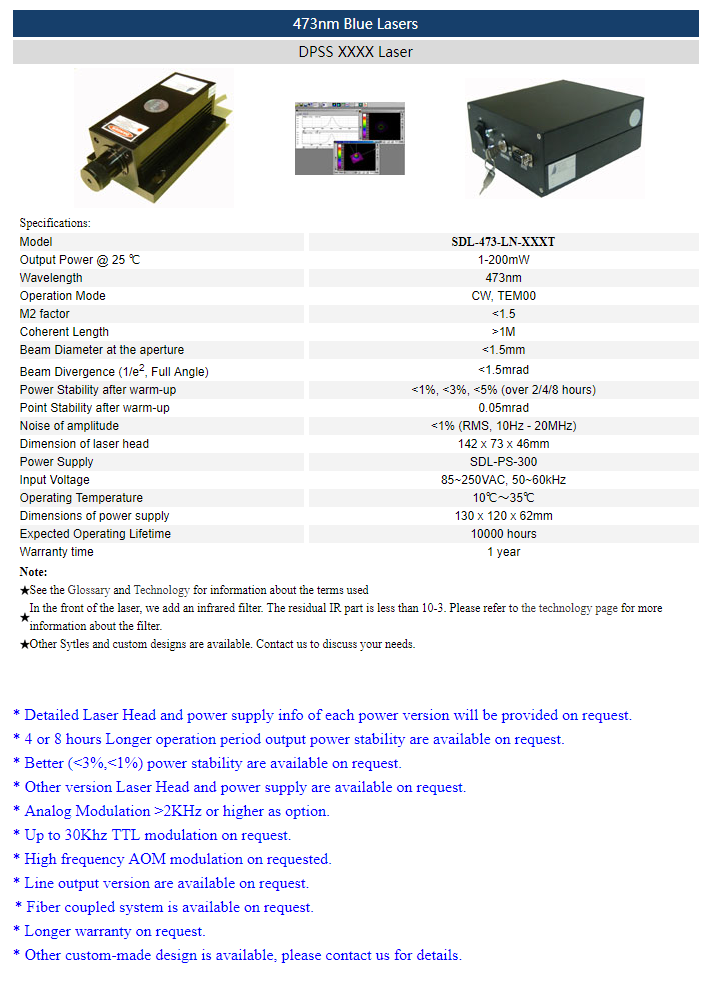 | 473 nm | 1 ~ 200 mW | <1% (rms, 10 Hz-20 MHz) |