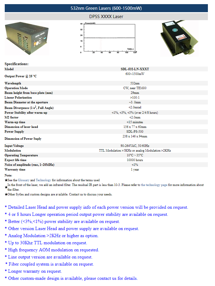 | 532 nm | 600 ~ 1500 mW | <1% (rms, 1-20 MHz) |