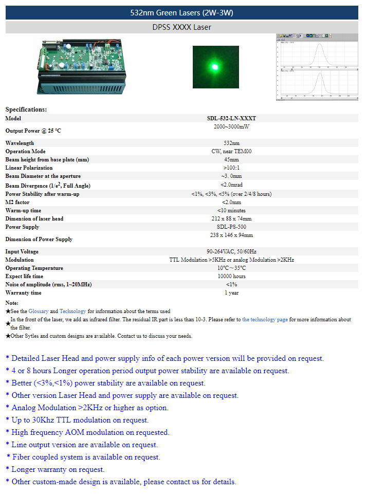 | 532 nm | 2 ~ 3 W | <1% (rms, 1-20 MHz) |