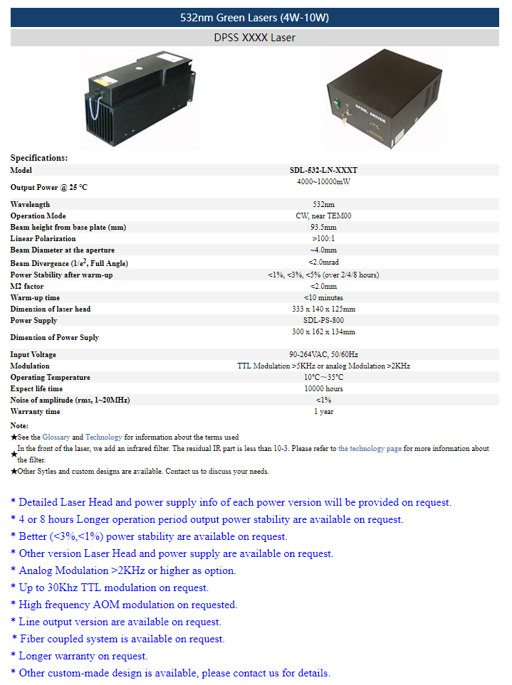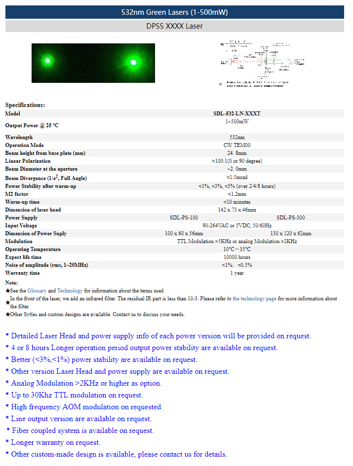 | 532.3 nm | 50 ~ 500 mW | ≤0.2% (rms, 10 Hz-20 MHz) |