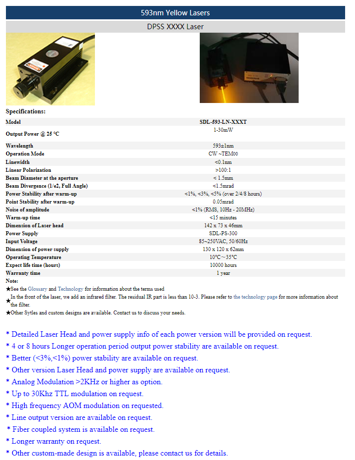 | 593 nm | 1 ~ 30 mW | <1% (rms, 10 Hz-20 MHz) |