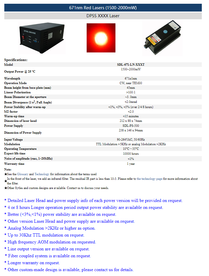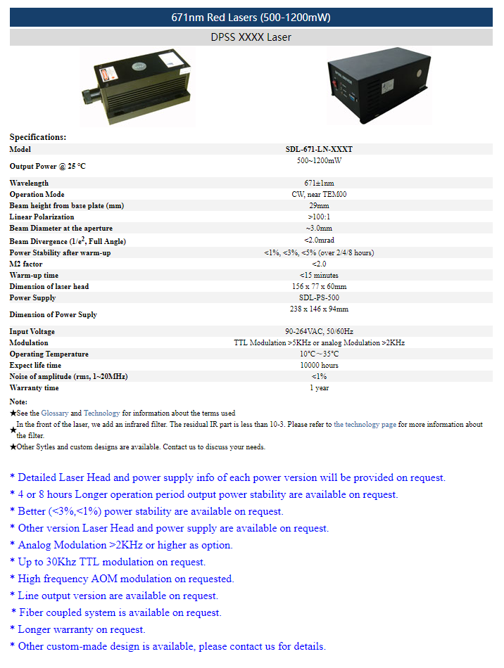 | 671 nm | 500 ~ 1200 mW | <1% (rms, 1-20 MHz) |