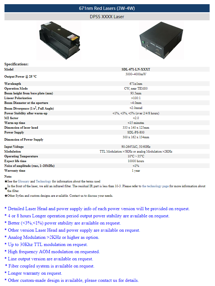 | 671 nm | 3 ~ 4 W | <1% (rms, 1-20 MHz) |