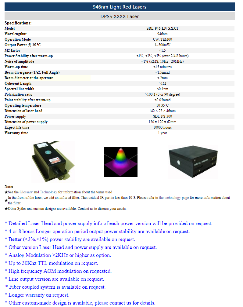 | 946 nm | 1 ~ 500 mW | <1% (rms, 10 Hz-20 MHz) |