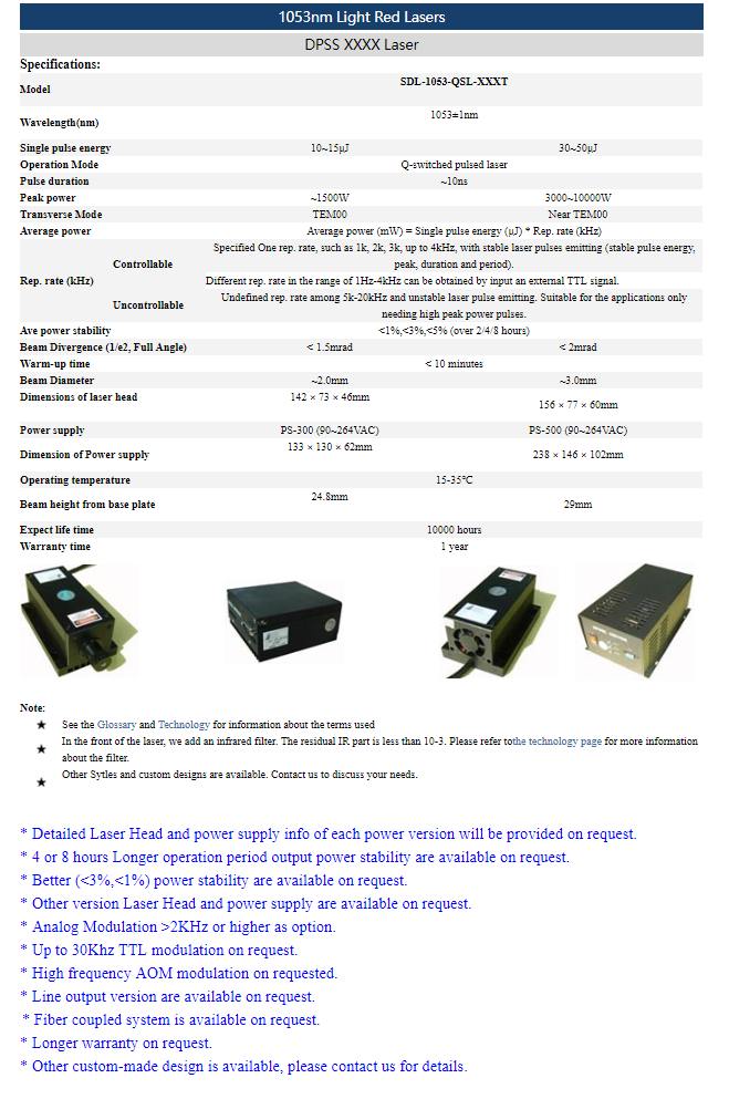 | 1053nm | 10 ~ 15μJ | ~ 1.5KW | TEM00 | |