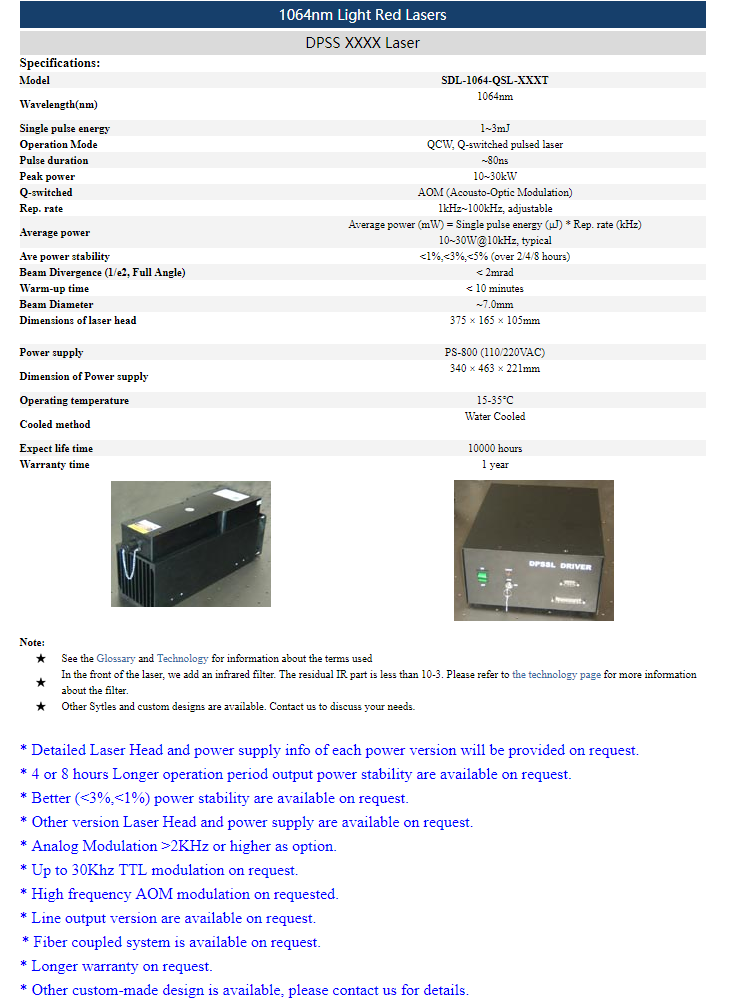 | 1064nm | 1 ~ 3mJ | 10 ~ 30KW | TEM00 | |