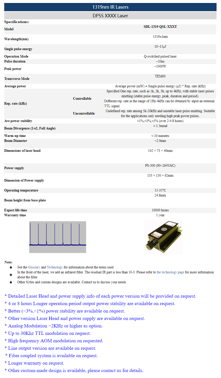 | 1319nm | 10 ~ 15μJ | ~ 1KW | TEM00 | |