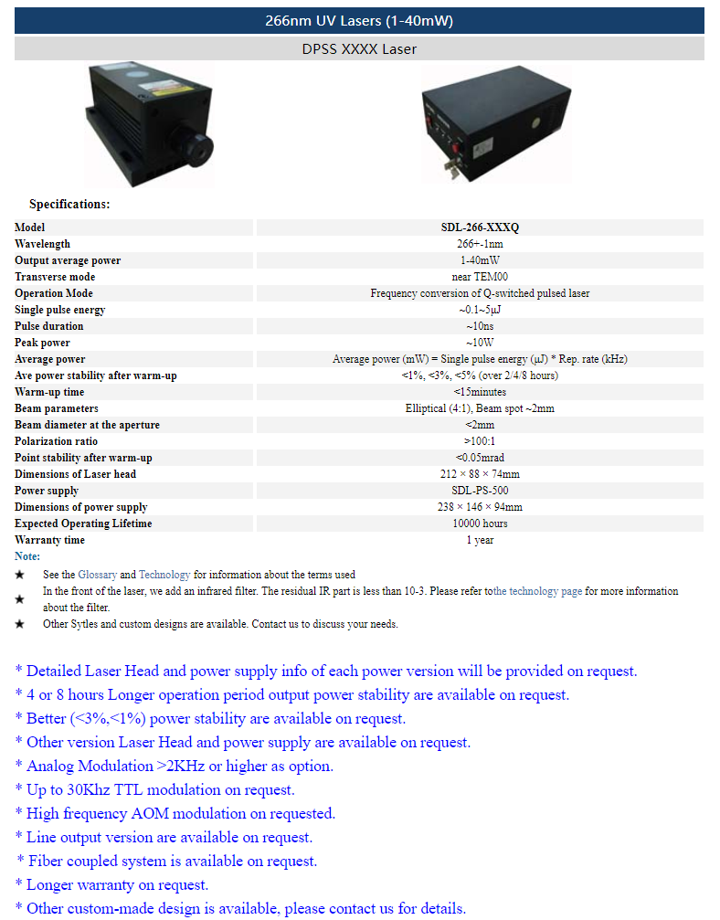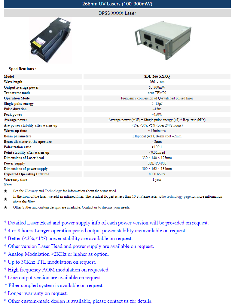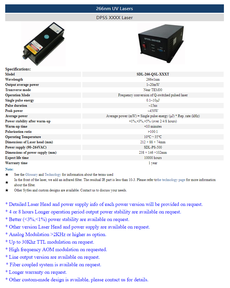 | 266nm | 0.1 ~ 5μJ | ~ 10W | nearTEM00 | |