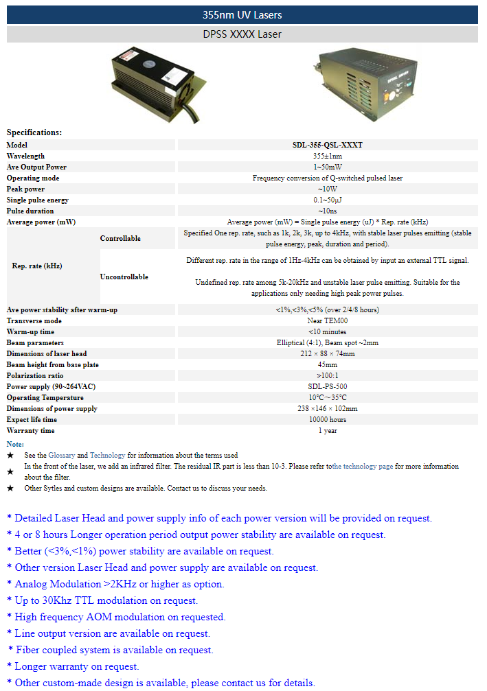 | 355nm | 0.1 ~ 50μJ | ~ 10W | nearTEM00 | |