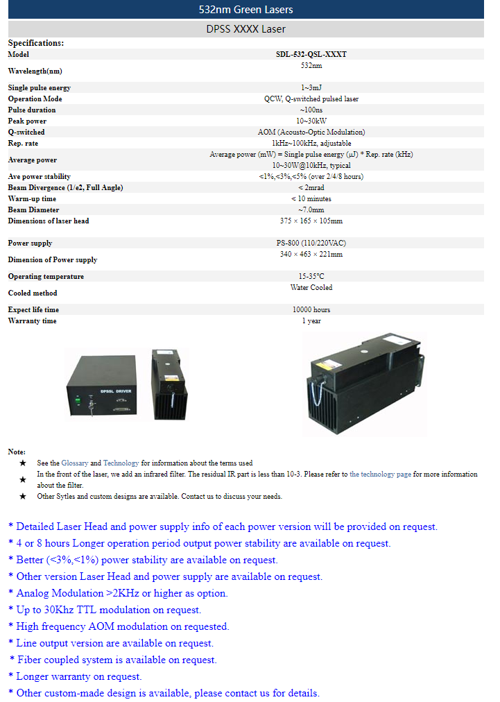 | 532nm | 1 ~ 3mJ | 10 ~ 30KW | TEM00 | |