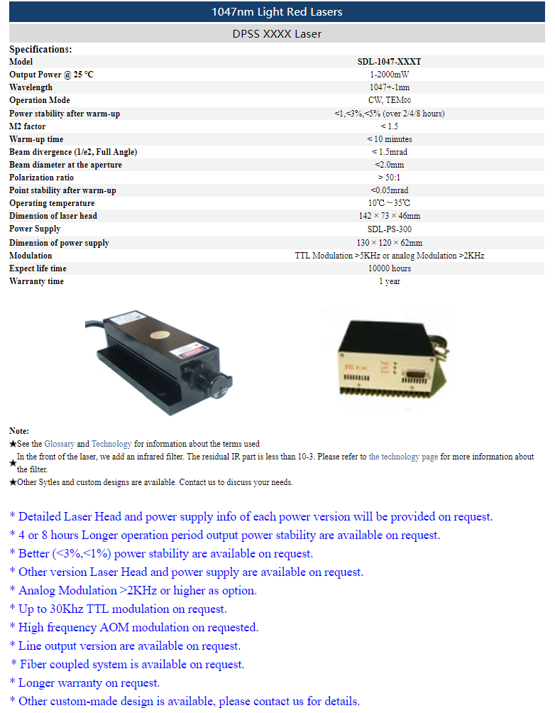 | 1047nm | 1 ~ 2,000mW | CW | TEM00 | |