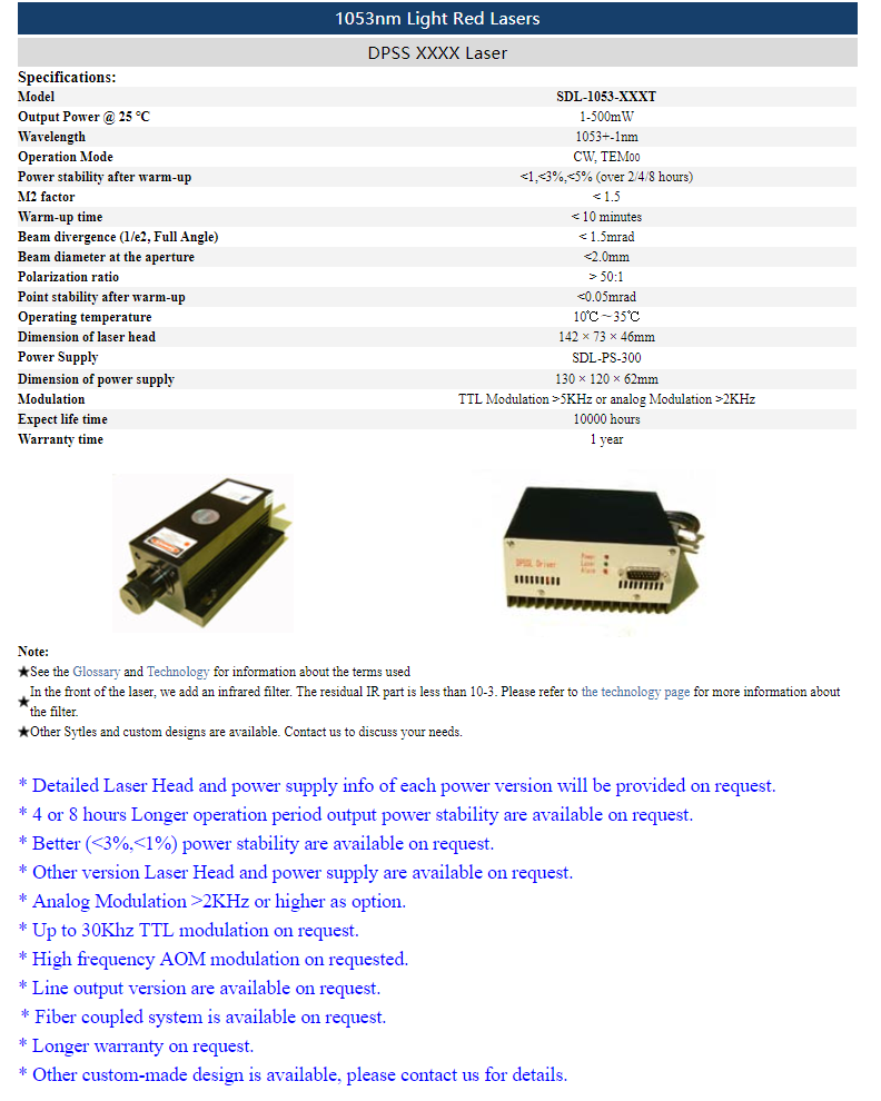 | 1053nm | 1 ~ 500mW | CW | TEM00 | |