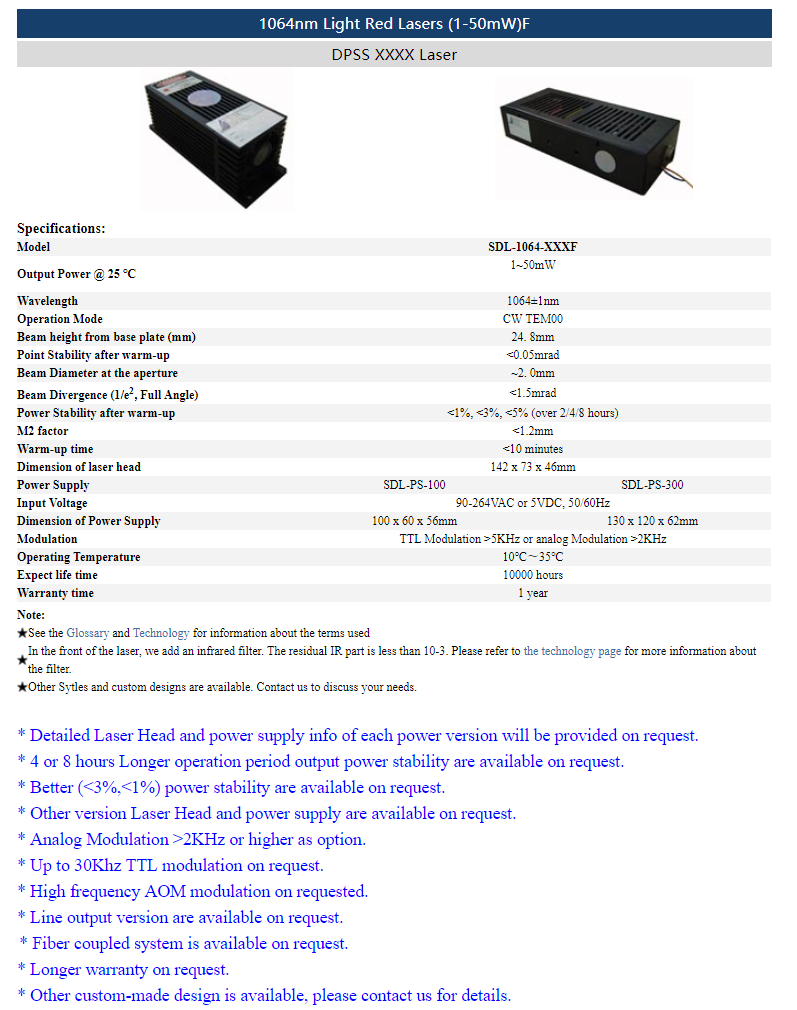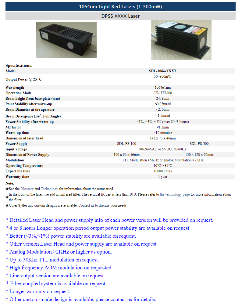 | 1064nm | 50~ 300mW | CW | TEM00 | |