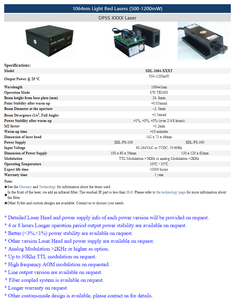 | 1064nm | 500 ~ 1,200mW | CW | TEM00 | |
