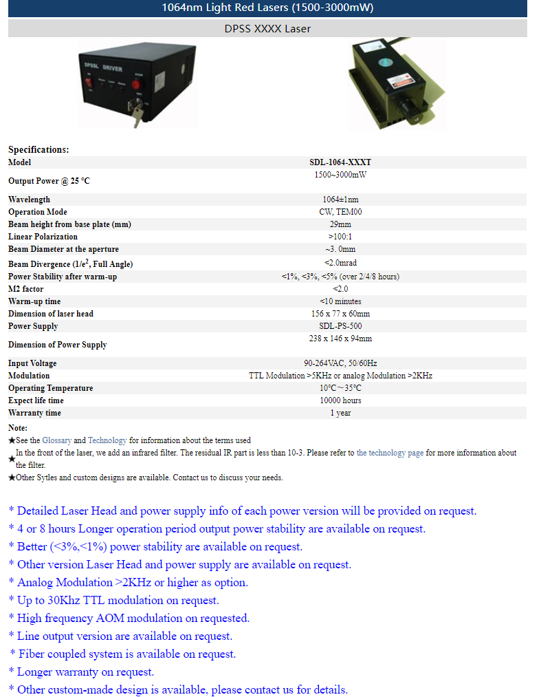 | 1064nm | 1.5 ~ 3W | CW | TEM00 | |