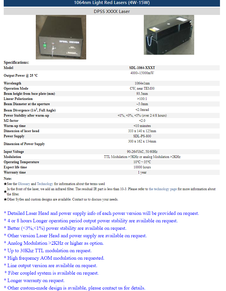 | 1064nm | 4 ~ 15W | CW | nearTEM00 | |