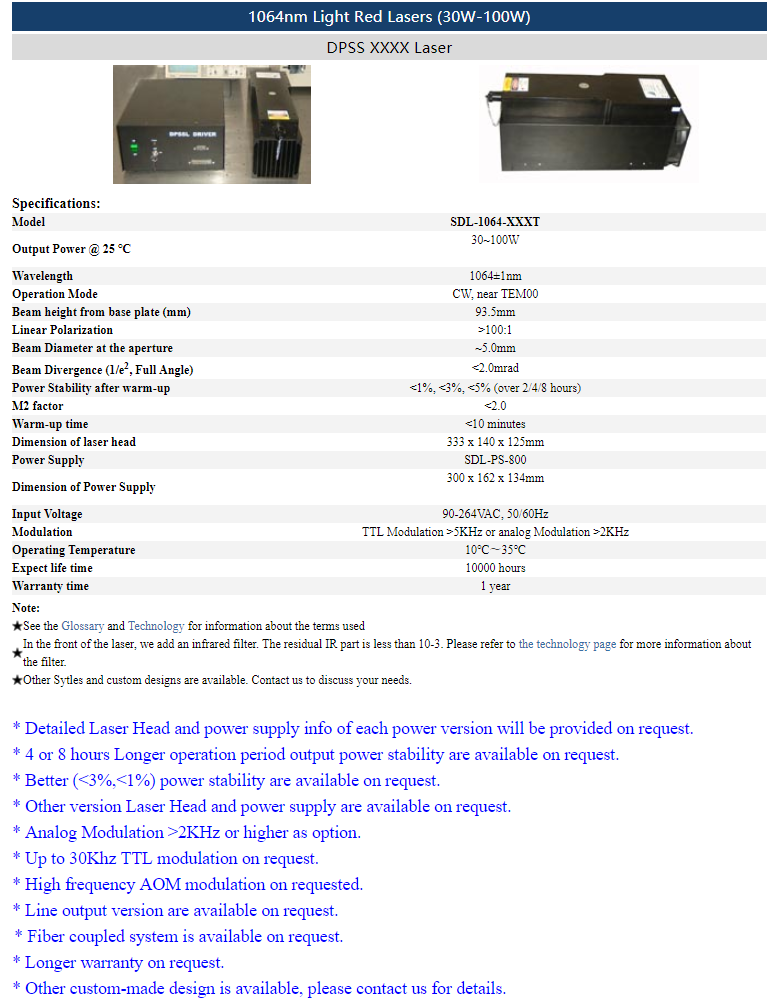 | 1064nm | 30 ~ 100W | CW | nearTEM00 | |