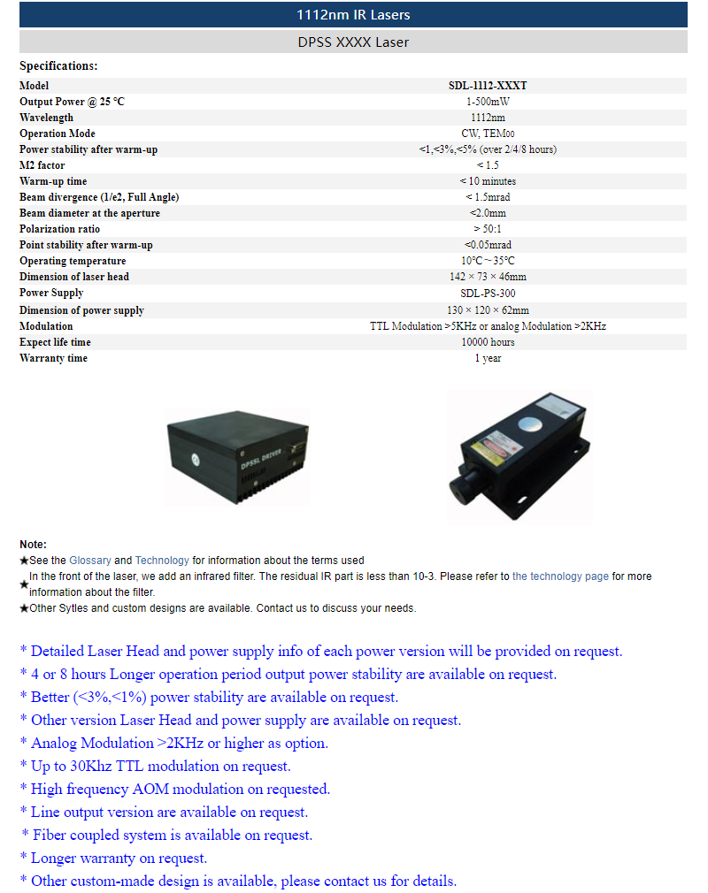 | 1112nm | 1 ~ 500mW | CW | TEM00 | |
