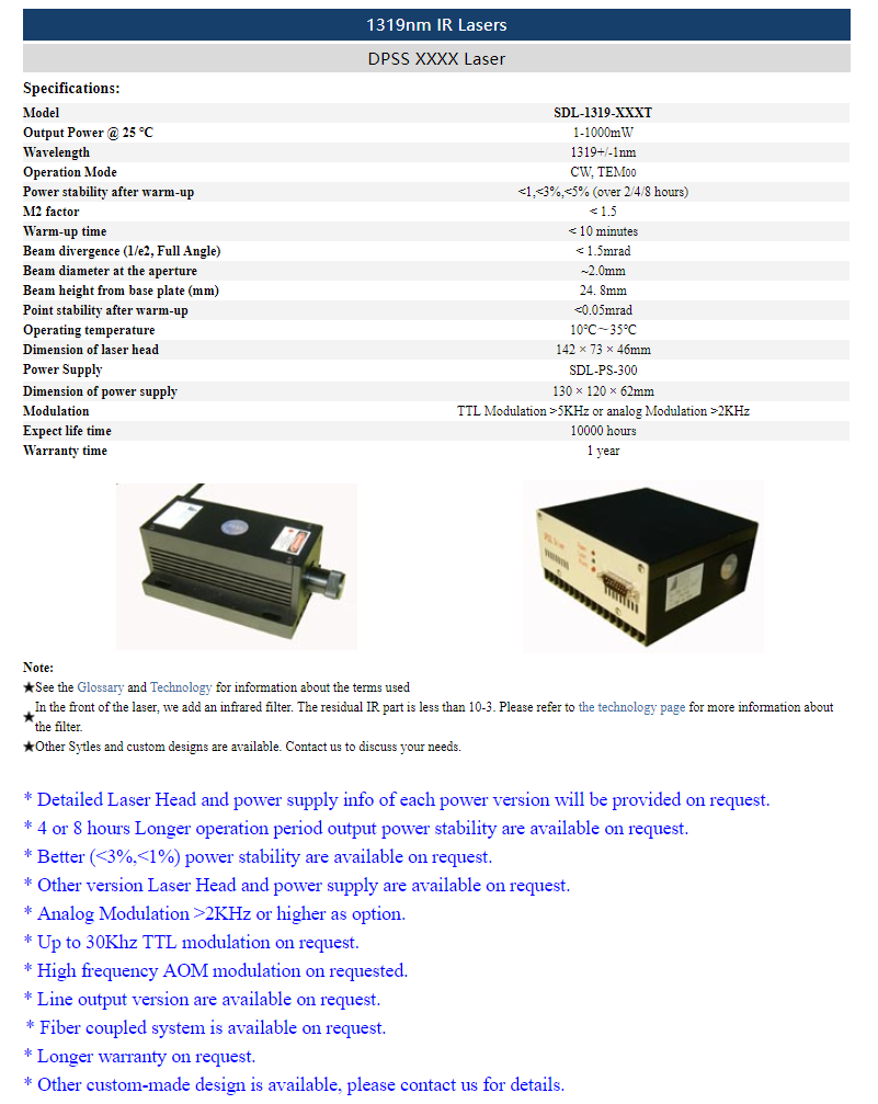 | 1319nm | 1 ~ 1,000mW | CW | TEM00 | |