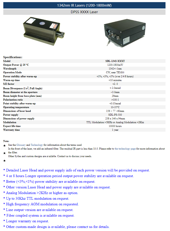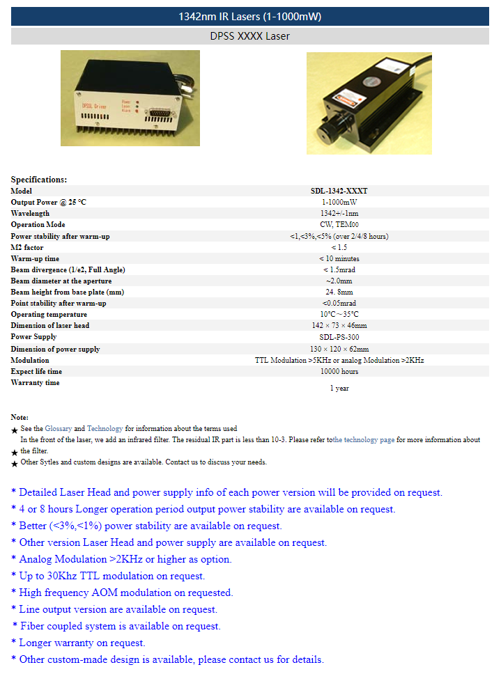 | 1342nm | 1 ~ 1,000mW | CW | TEM00 | |