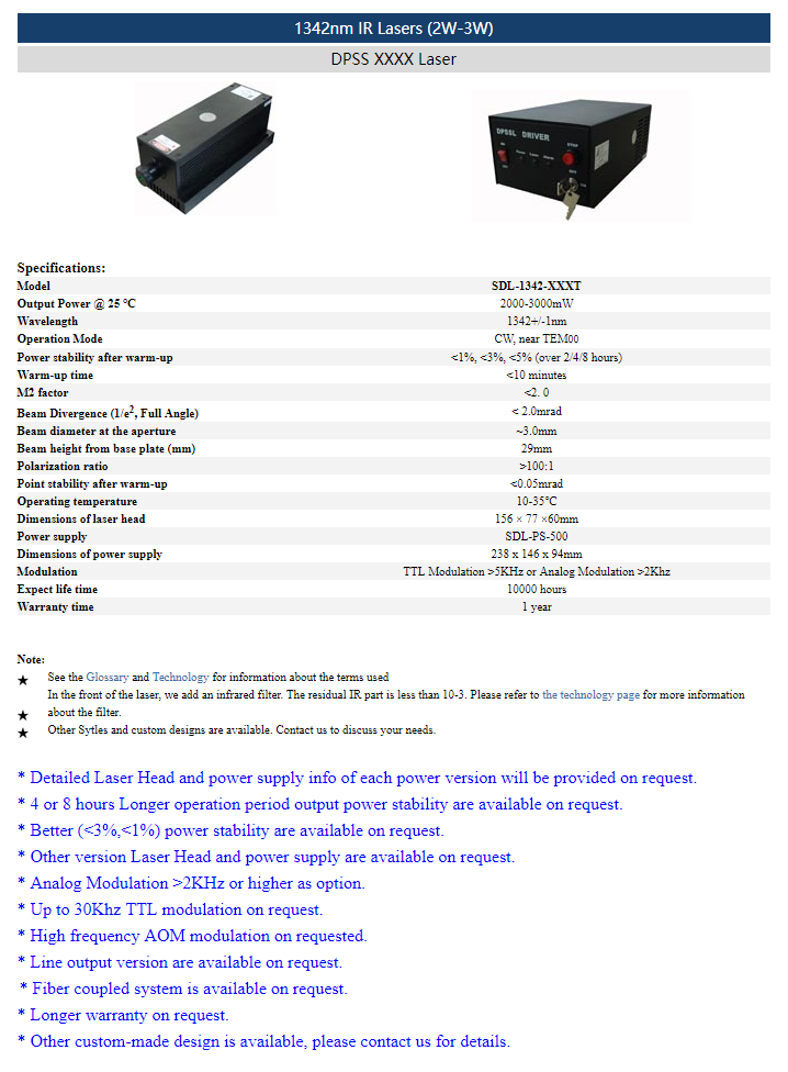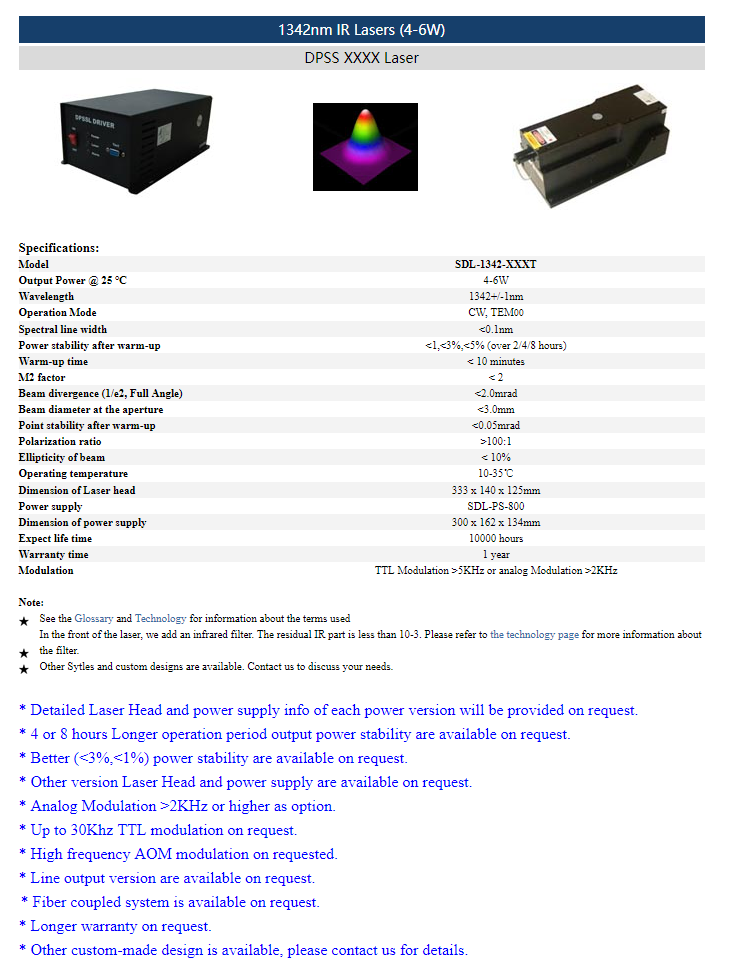 | 1342nm | 4 ~ 6W | CW | TEM00 | |