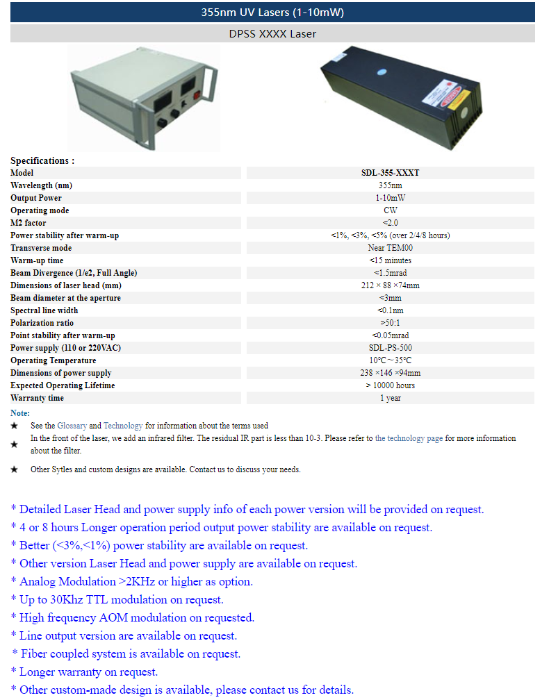 | 355nm | 1 ~ 10mW | CW | nearTEM00 | |