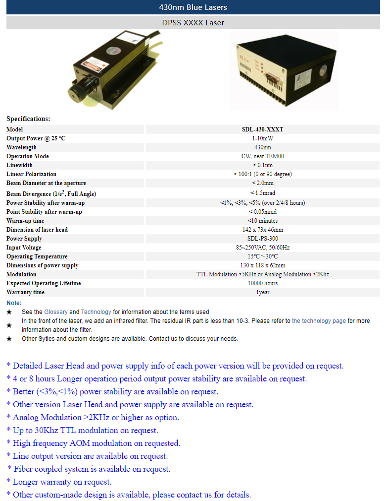 | 430nm | 1 ~ 10mW | CW | nearTEM00 | |