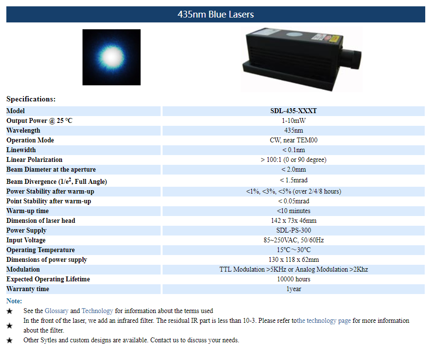 | 435nm | 1 ~ 10mW | CW | nearTEM00 | |