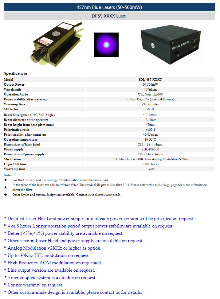 | 457nm | 50 ~ 500mW | CW | nearTEM00 | |