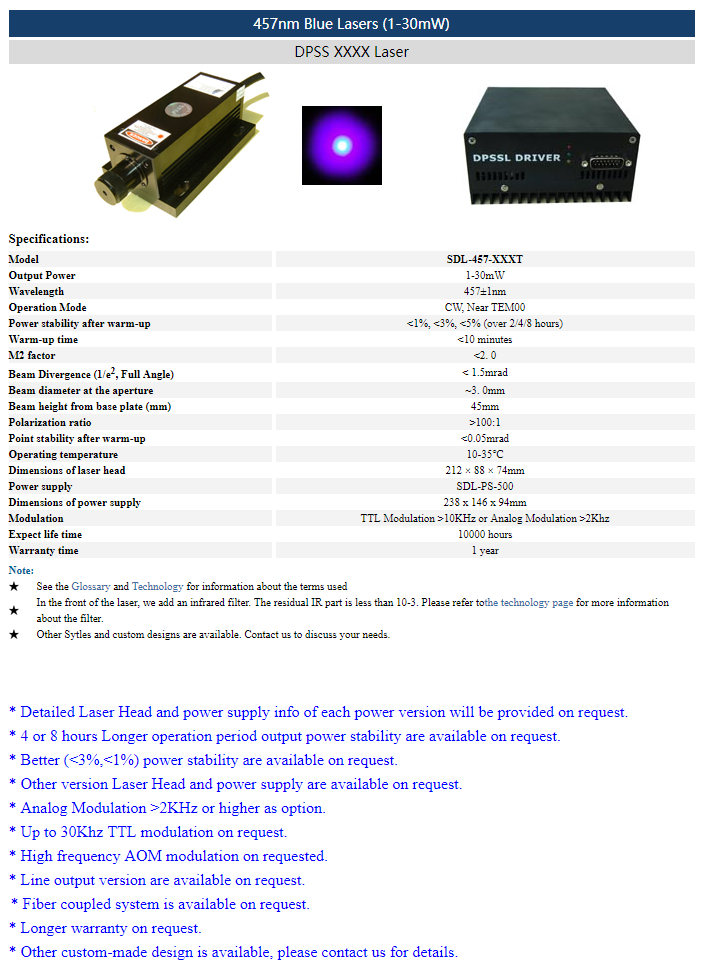 | 457nm | 1 ~ 30mW | CW | nearTEM00 | |