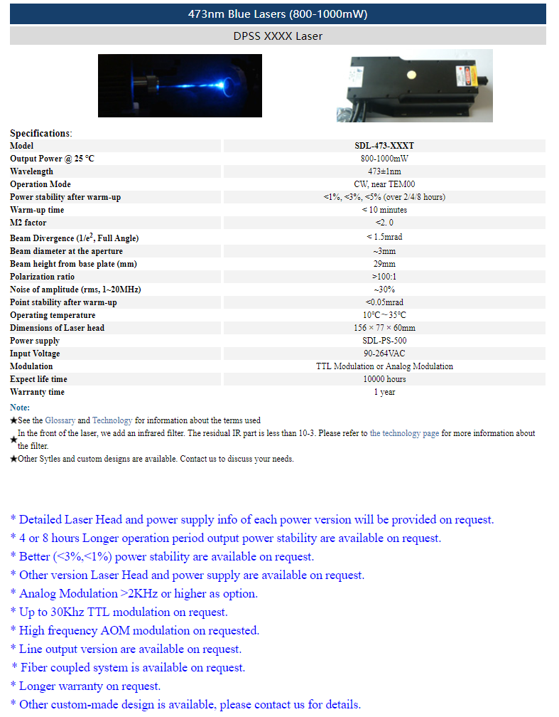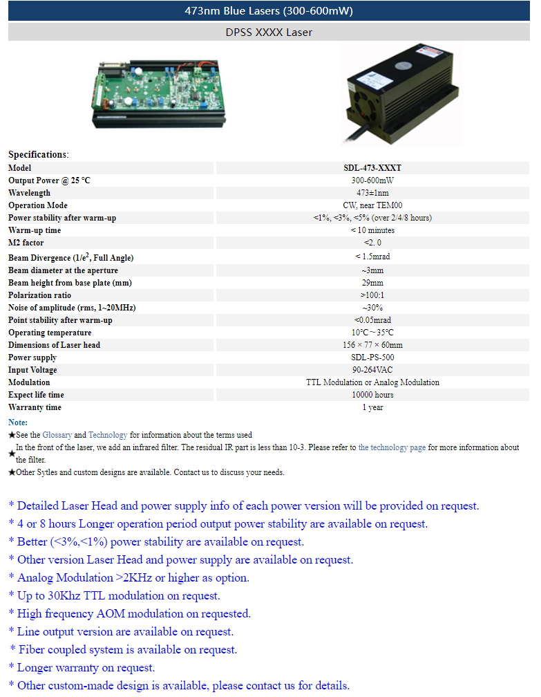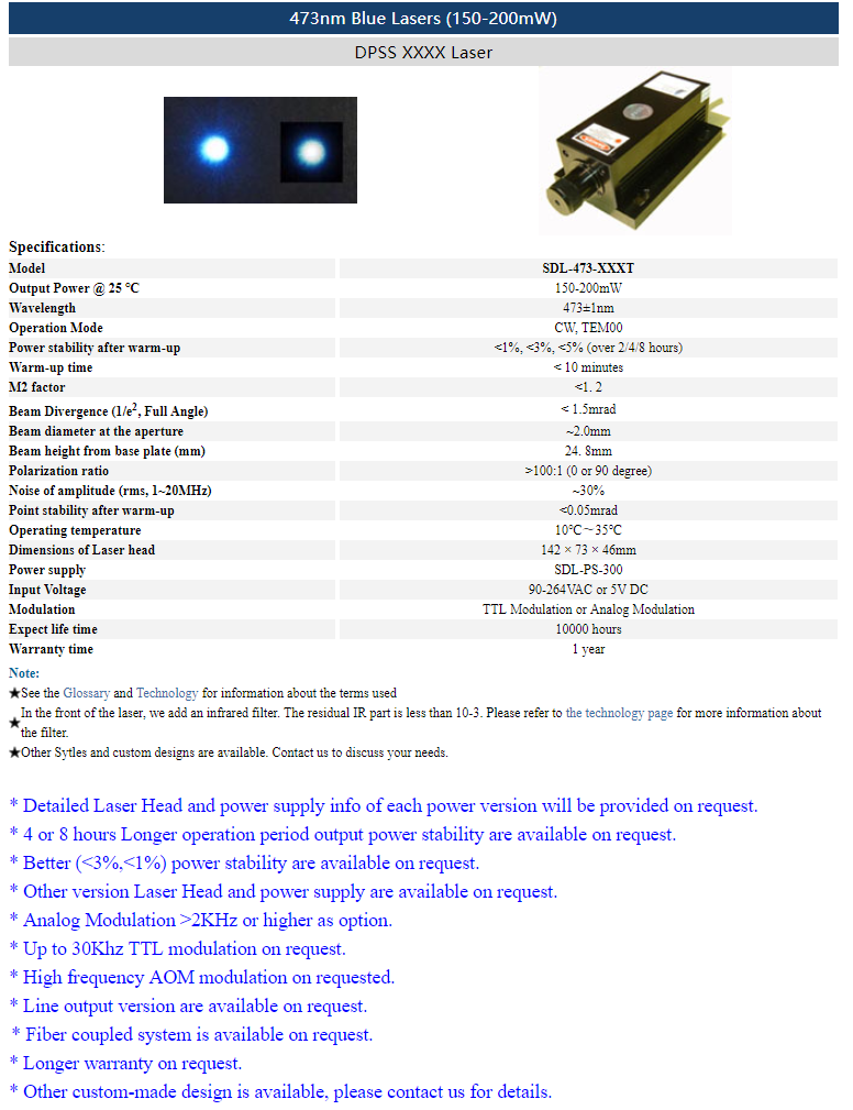 | 473nm | 150 ~ 200mW | CW | TEM00 | |