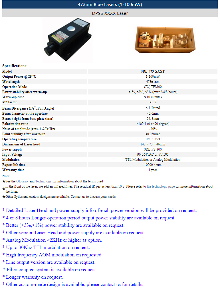 | 473nm | 1 ~ 100mW | CW | TEM00 | |