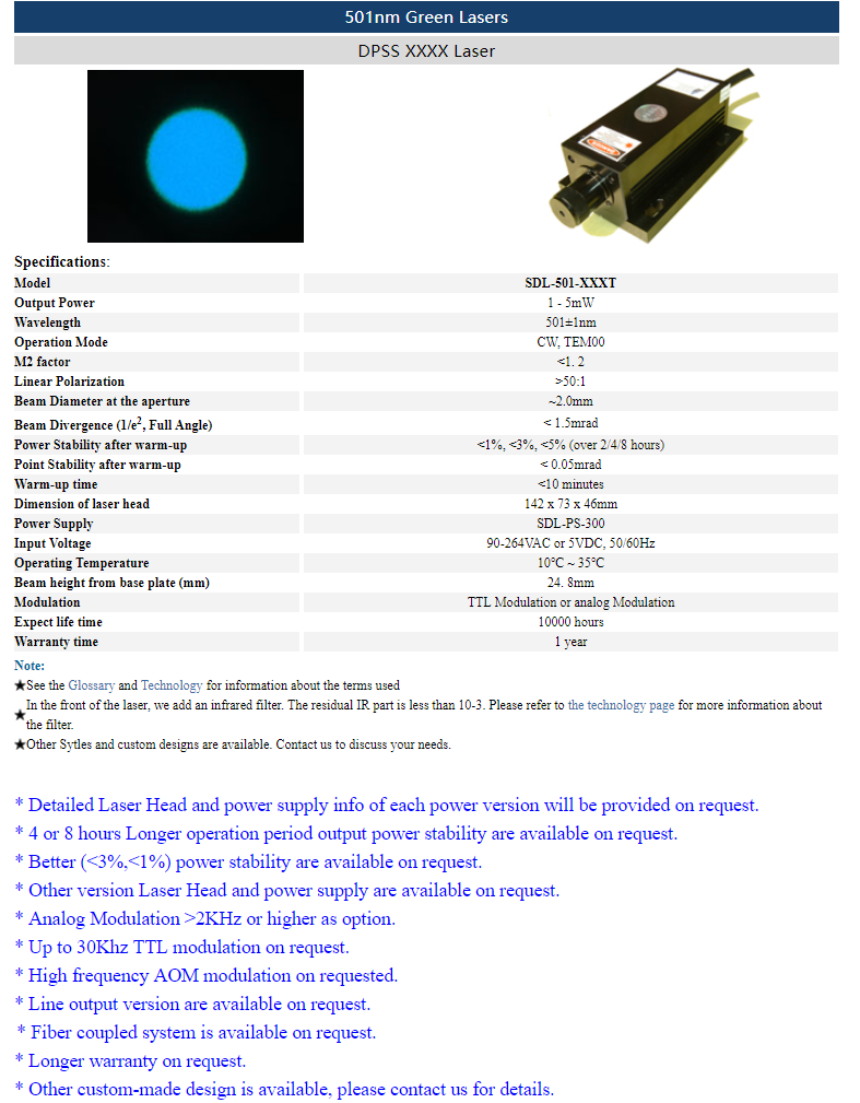 | 501nm | 1 ~ 5mW | CW | TEM00 | |