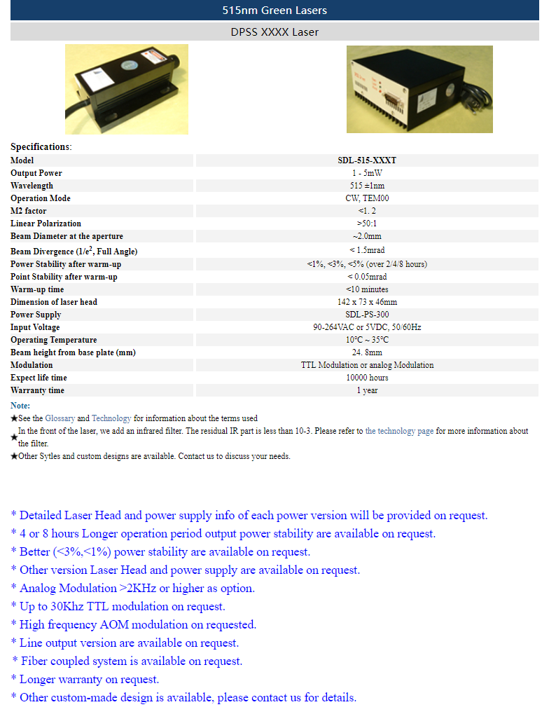 | 515nm | 1 ~ 5mW | CW | TEM00 | |