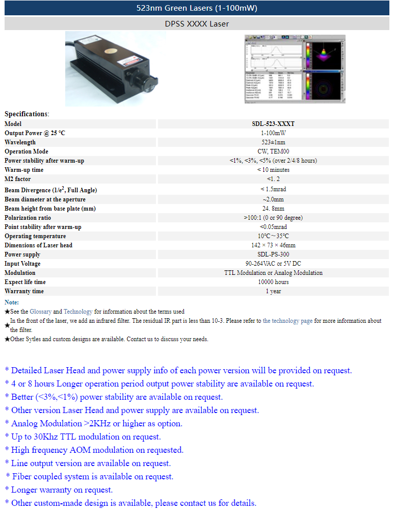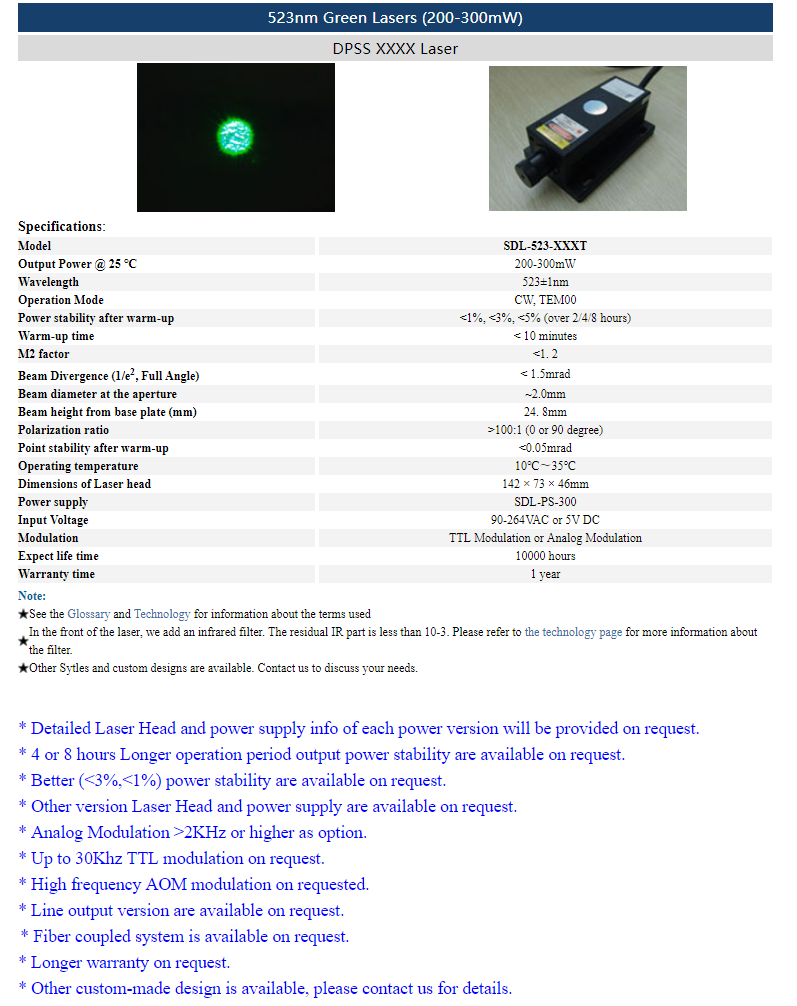 | 523nm | 200 ~ 300mW | CW | TEM00 | |
